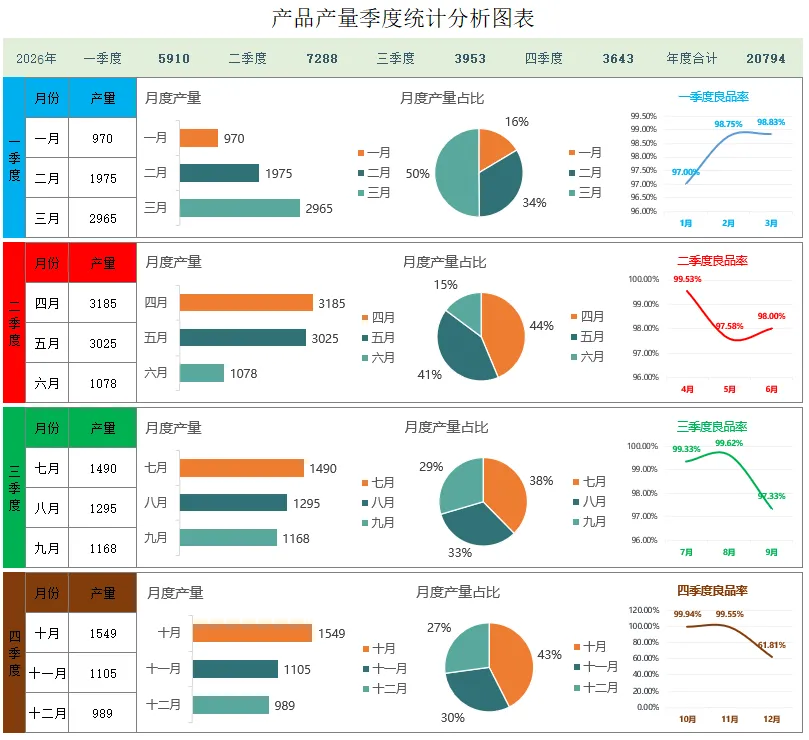 今天给大家推荐一款自动汇总、图表联动、公式预设的Excel模板:《产品产量季度统计分析图表》,让数据录入更高效,统计更直观!