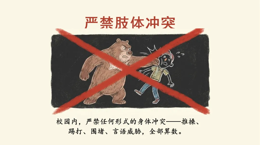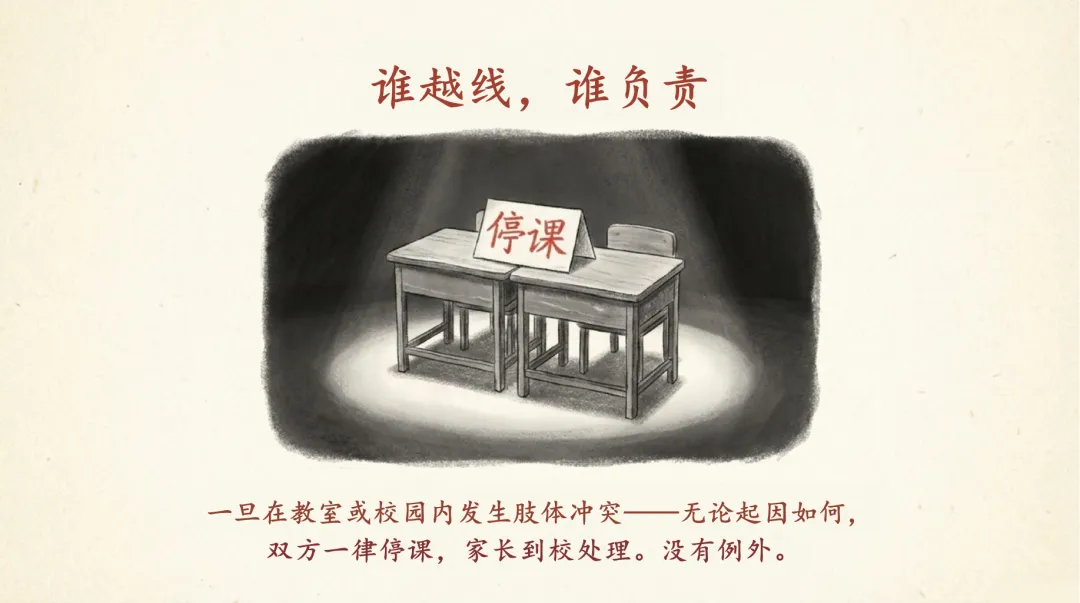 ·严禁肢体冲突:校园内严禁任何形式的身体冲突,包括推搡、踢打、围堵、言语威胁。一旦发生,双方一律停课,家长到校处理。