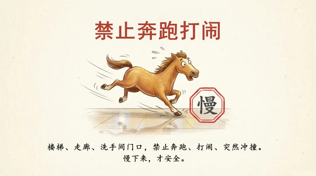 ·禁止奔跑打闹:楼梯、走廊、洗手间门口禁止奔跑、打闹、突然冲撞。慢下来,才安全。