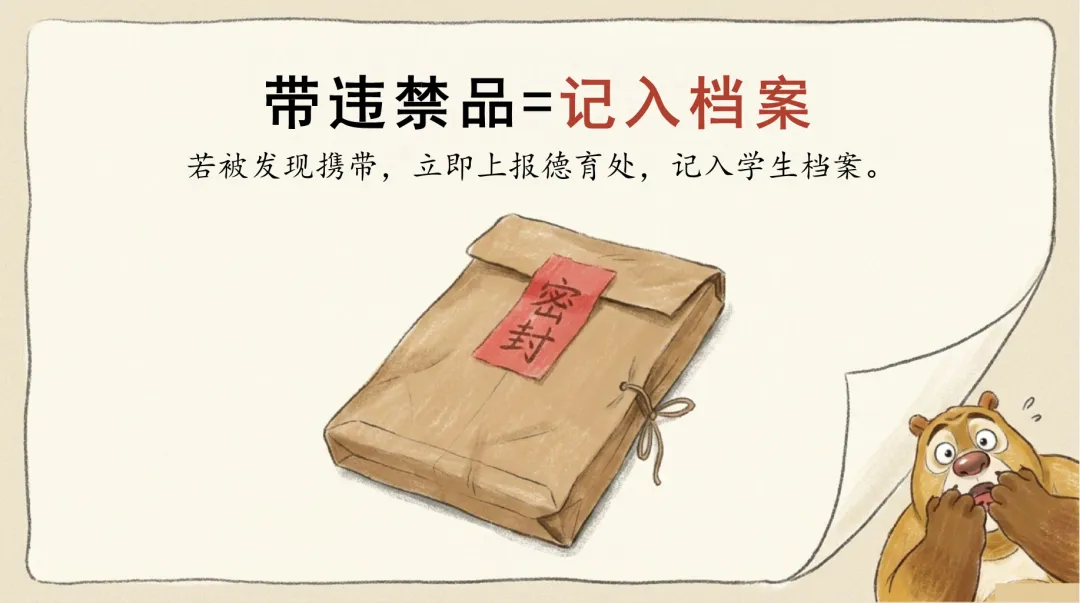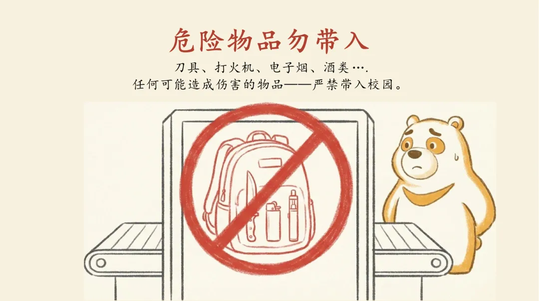 ·危险物品勿带入:刀具、打火机、电子烟、酒类等可能造成伤害的物品严禁带入校园,否则记入档案。
