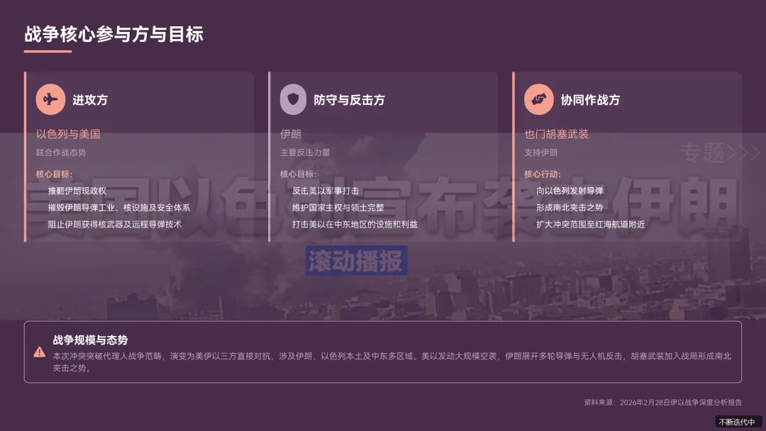 本次冲突突破代理人战争范畴,演变为美伊以三方直接对抗,涉及伊朗、以色列本土及中东多区域。美以发动大规模空袭,伊朗展开多轮导弹与无人机反击,胡塞武装加入战局形成南北夹击之势,冲突进入高强度消耗阶段,作战区域广度、远程弹药投入量及持续时间均可能创近年新高《伊朗快速反击美以空袭后导弹雨直扑以色列胡塞武装同步参战.pdf》。