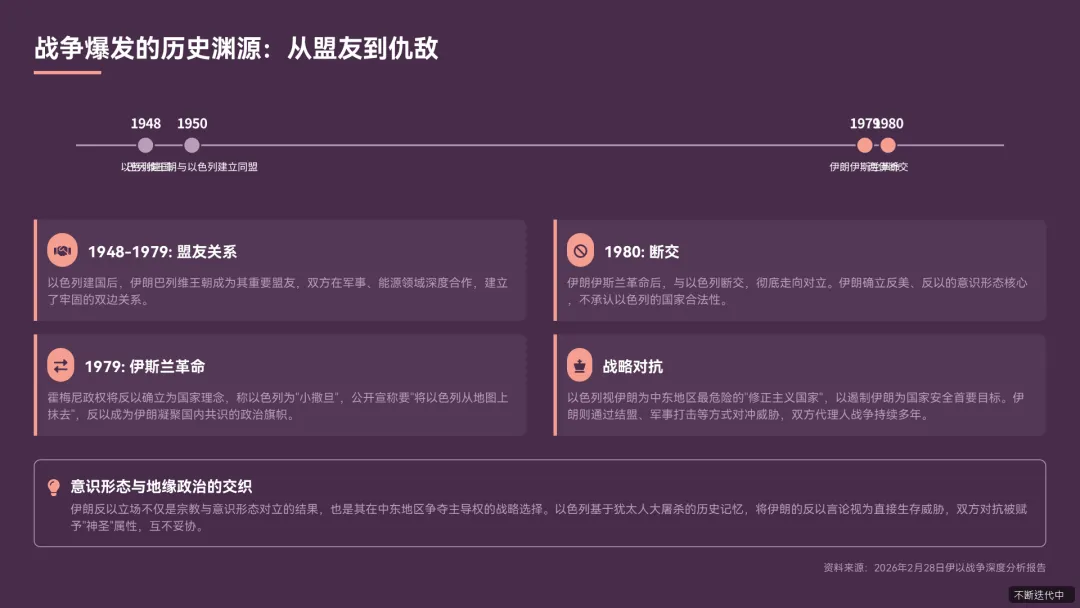 1948 年以色列建国后,伊朗巴列维王朝曾是其重要盟友,双方在军事、能源领域深度合作。但 1979 年伊朗伊斯兰革命后,霍梅尼政权将反以确立为国家理念,称以色列为 “小撒旦”,1980 年两国断交,彻底走向对立《读懂伊朗和以色列为何常年势同水火.pdf》。