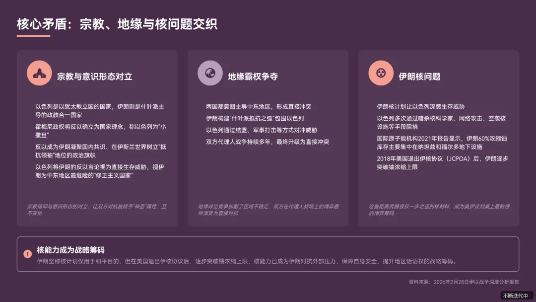 - 宗教与意识形态对立以色列是以犹太教立国的国家,伊朗则是什叶派主导的政教合一国家,宗教信仰与意识形态的对立,让双方对抗被赋予 “神圣” 属性,互不妥协《读懂伊朗和以色列为何常年势同水火.pdf》。