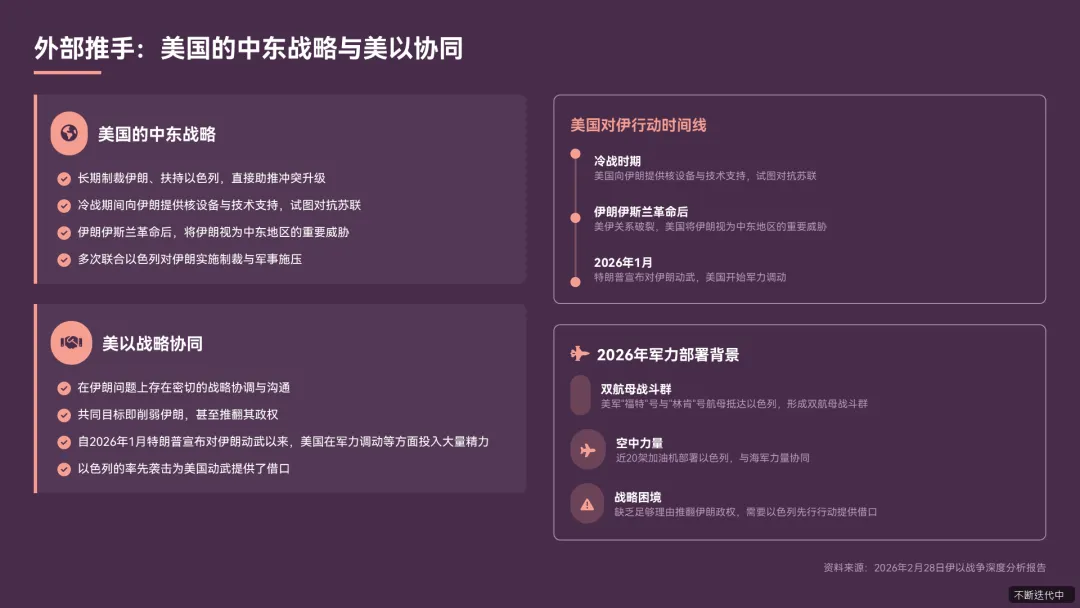 - 美以战略协同美国和以色列在伊朗问题上存在密切的战略协调与沟通,拥有共同目标即削弱伊朗,甚至推翻其政权。自 2026 年 1 月特朗普宣布会对伊朗动武以来,美国在军力调动等方面投入不少精力,但缺乏足够理由推翻伊朗政权,而以色列的率先袭击恰好为美国动武提供了借口《专家以色列率先袭击伊朗至少有两方面的考虑.pdf》。