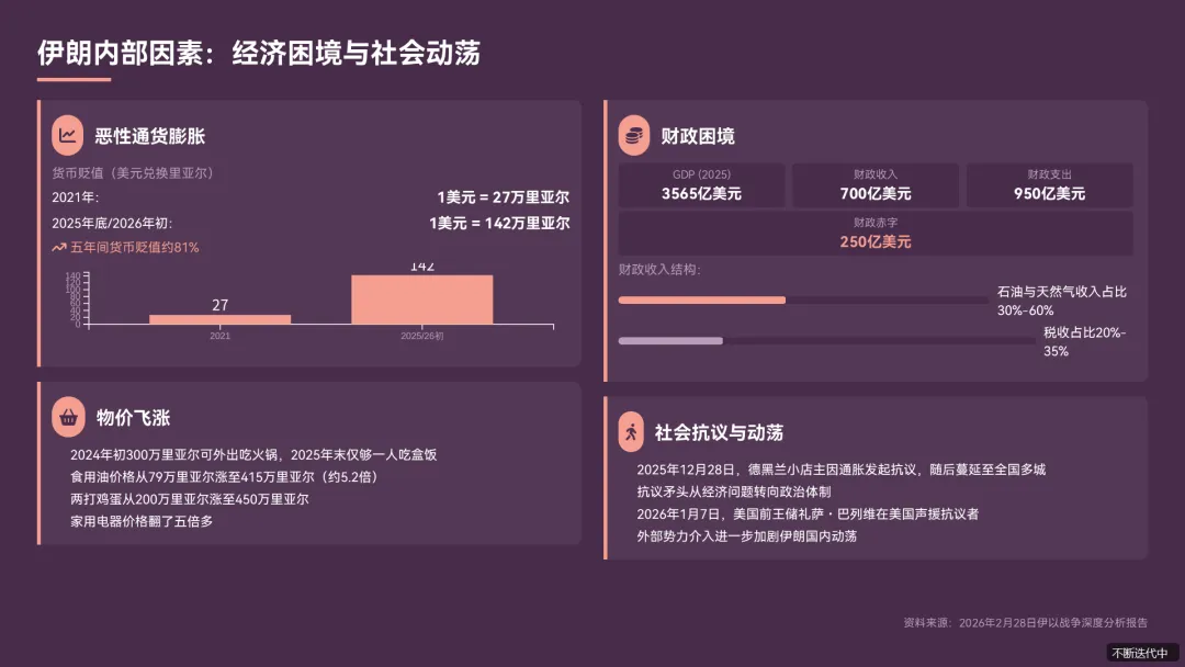 - 财政困境2025 年,伊朗 GDP 约 3565 亿美元,财政收入约 700 亿美元,财政支出约 950 亿美元,财政赤字高达 250 亿美元《以色列大规模袭击伊朗.pdf》。为填补财政窟窿,伊朗政府采取透支国家开发基金、发行高利率国债、印钱等方式,进一步加剧了通货膨胀《以色列大规模袭击伊朗.pdf》。
