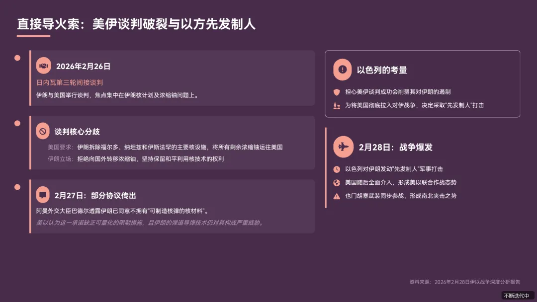以色列担心美伊谈判成功会削弱其对伊朗的遏制,同时为将美国彻底拉入对伊战争,决定采取 “先发制人” 打击《专家伊朗或导弹袭击以色列本土.pdf》。2 月 28 日,以色列正式发动军事打击,美国随后全面介入,战争爆发《专家以色列率先袭击伊朗至少有两方面的考虑.pdf》。
