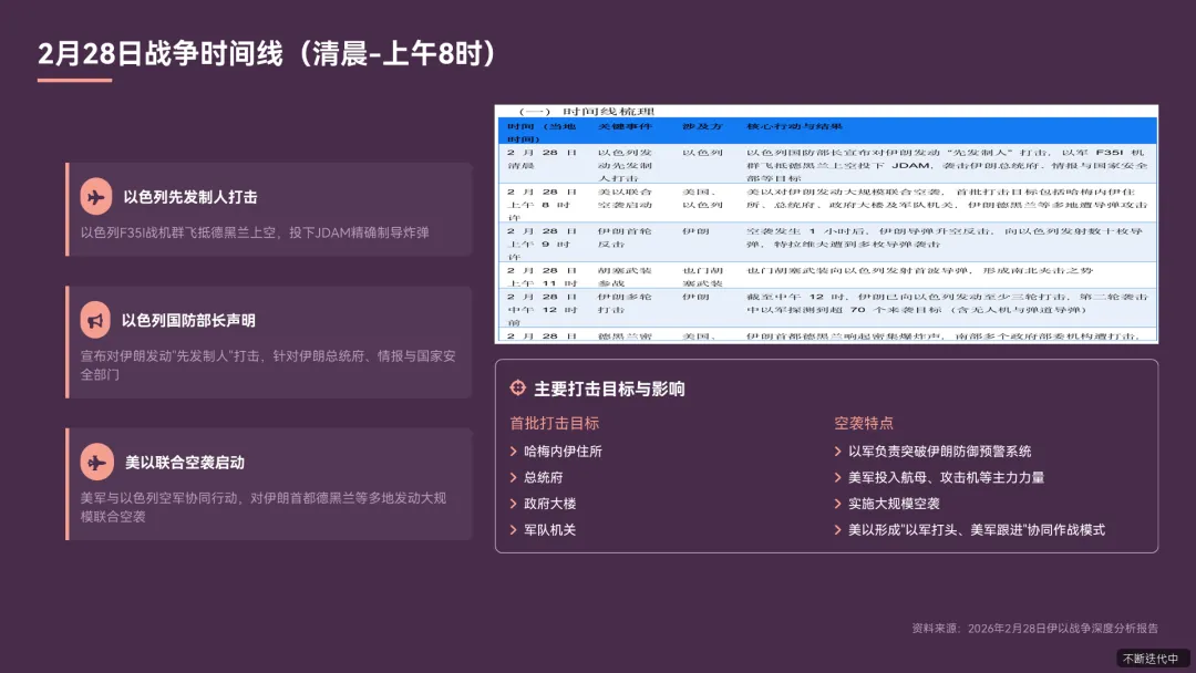 - 美以持续空袭按照美以预先规划,以色列将实施为期四天的密集联合打击,美国军事行动将至少持续到周末后,双方将继续集中力量打击伊朗的导弹基地、核设施、军事指挥中心等关键目标,试图瘫痪伊朗的反击能力《以媒曝光袭击伊朗细节以军打头美军跟进.pdf》《果不其然以色列对伊朗率先动手了.pdf》。