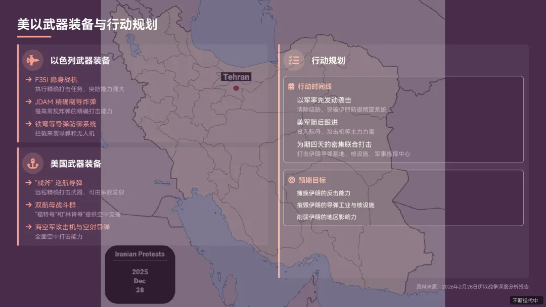 - 美以双方数月来对 2 月 28 日的行动进行紧密共同策划,数周前确定行动日期,形成 “以军打头、美军跟进” 的协同作战模式《以媒曝光袭击伊朗细节以军打头美军跟进.pdf》。