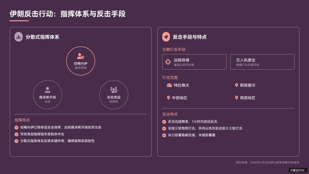 - 指挥体系哈梅内伊已转移至安全地带,总统佩泽希齐扬安然无恙,军政高层指挥链未受致命冲击,分散式指挥体系发挥关键作用《伊朗快速反击美以空袭后导弹雨直扑以色列胡塞武装同步参战.pdf》。