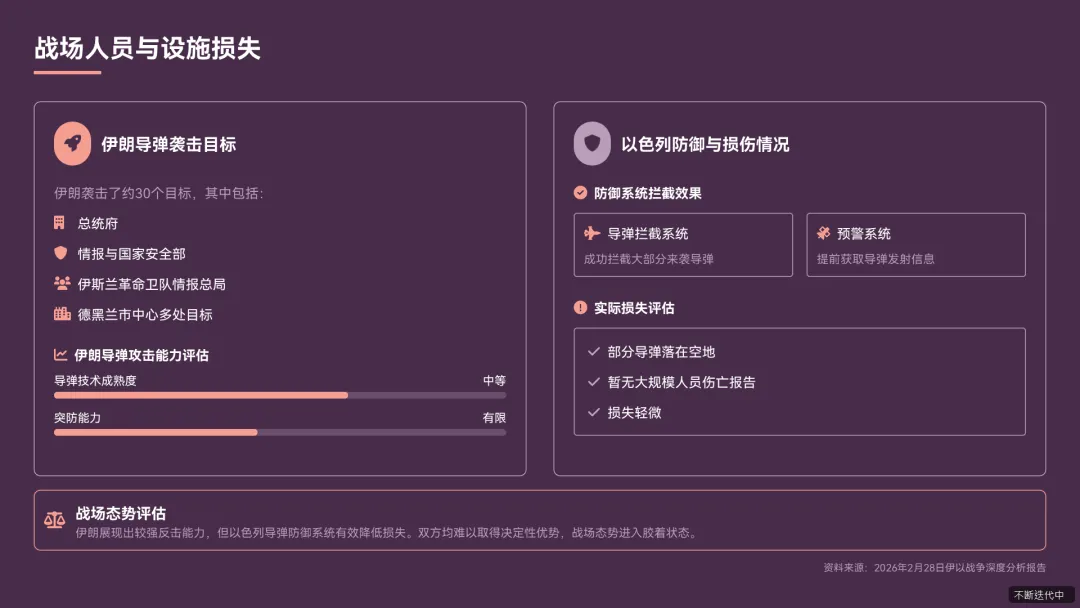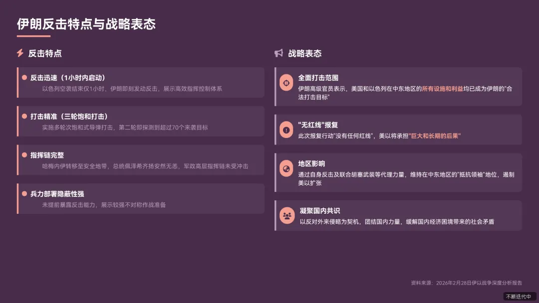 - 作战特点反击迅猛精准,1 小时内启动反击,实施三轮饱和打击,兵力部署隐蔽性强,未提前暴露《伊朗快速反击美以空袭后导弹雨直扑以色列胡塞武装同步参战.pdf》。