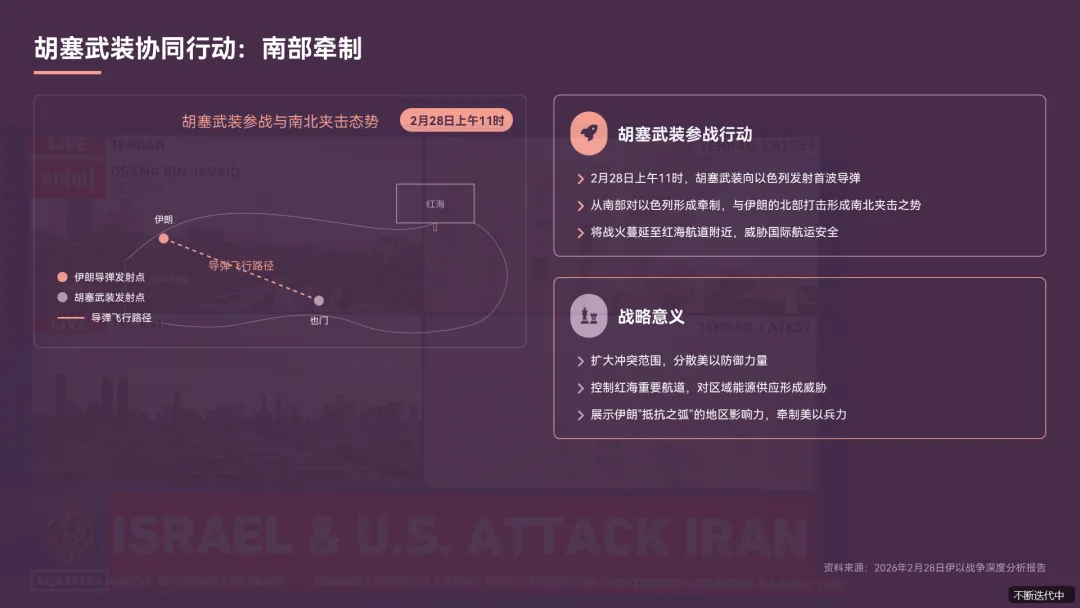 - 作为伊朗的地区代理力量,胡塞武装于 2 月 28 日 11 时向以色列发射首波导弹,从南部对以色列形成牵制,与伊朗的北部打击形成南北夹击之势,将战火蔓延至红海航道附近《伊朗快速反击美以空袭后导弹雨直扑以色列胡塞武装同步参战.pdf》。