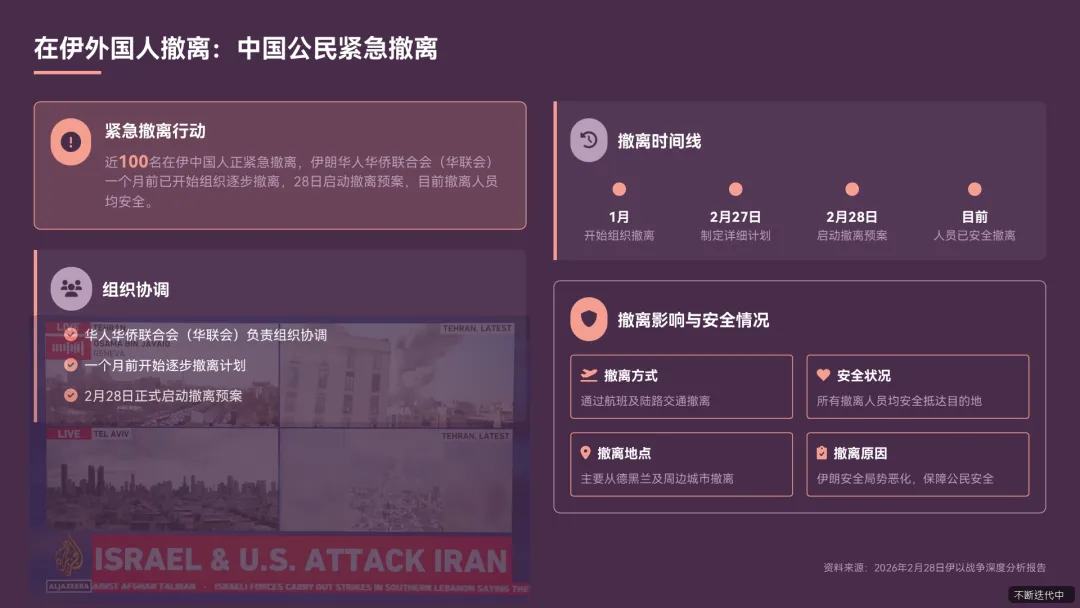 - 近 100 名在伊中国人正紧急撤离,伊朗华人华侨联合会(华联会)一个月前已开始组织逐步撤离,28 日启动撤离预案,目前撤离人员均安全《伊朗已发射数十枚导弹以色列响起爆炸声近 100 名在伊中国人正紧急撤离伊朗部分地区手机通信已中断或减弱.pdf》。
