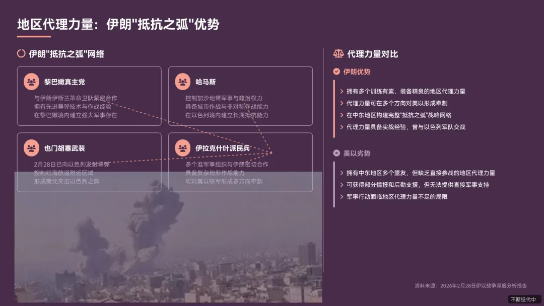 - 伊朗扶持了黎巴嫩真主党、哈马斯、也门胡塞武装等地区代理力量,形成对抗美以的 “抵抗之弧”《果不其然以色列对伊朗率先动手了.pdf》。