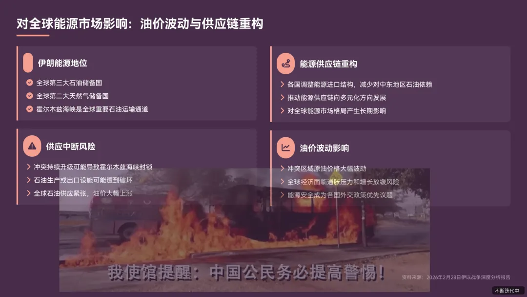 - 油价波动风险伊朗是全球重要的石油生产国和出口国,原油储量全球第三,天然气储量全球第二,霍尔木兹海峡是全球重要的石油运输通道(中东石油多经此运输)《以色列大规模袭击伊朗.pdf》。若冲突持续升级,伊朗可能封锁霍尔木兹海峡,或石油生产、出口设施遭到破坏,将导致全球石油供应紧张,油价大幅上涨《伊朗快速反击美以空袭后导弹雨直扑以色列胡塞武装同步参战.pdf》。