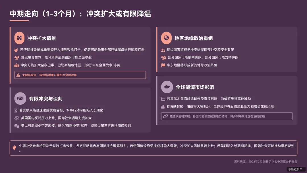 - 核问题:若伊朗政权存续,可能加速推进核计划,中东地区核扩散风险上升;若亲美政权上台,可能重新签署核协议,核问题得到暂时缓解,但长期仍存在不确定性《果不其然以色列对伊朗率先动手了.pdf》。