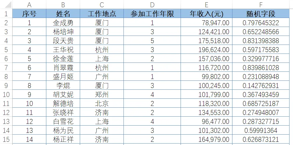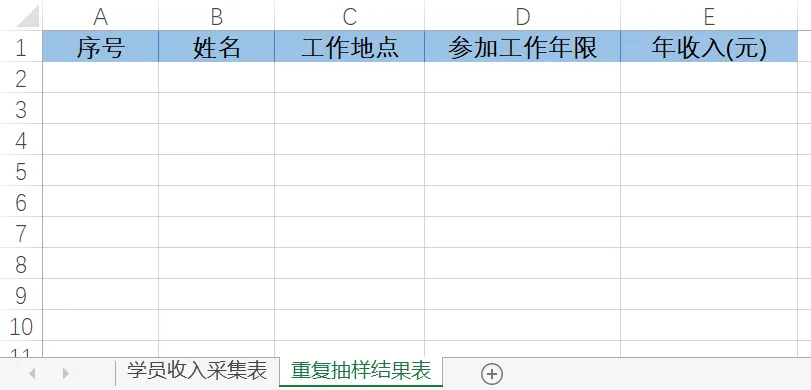 在数据分析中,抽样是指从全部数据中选择部分数据进行分析,以发掘更大规模数据集中的有用信息。在收集数据过程中,绝大多数情况下,并不采取普查的方式获取总体中所有样本的数据信息,而是以各类抽样方法抽取其中若干代表性样本来进行数据获取和分析。抽样的常见方法有单纯随机抽样、等距抽样和分层抽样等。图4-113展示了某培训机构采集到的学员年收入数据表,需要采用不重复抽样的方式,从中随机抽取100条记录。步骤1:在F1单元格输入标题:随机字段。在F2单元格输入公式=RAND(),并向下复制填充。RAND函数可以随机生成一个大于等于0且小于1的小数,而且产生的随机数几乎不会重复。公式运算效果如图4-114所示。图 4-114 使用 RAND 函数生成一列随机值步骤2:依次按下<Alt>键、<D>键、<F>键和<F>键,使数据列表进入筛选状态。单击F1单元格的筛选按钮,在弹出的下拉菜单中,依次单击【数字筛选】→【前10项】,在弹出的【自动筛选前10个】对话框中分别设置【显示】为“最大”“100”“项”,单击【确定】按钮关闭对话框,即可获取100条随机抽取的记录,如图4-115所示。依然以图4-113展示的学员年收入采集表为例,倘若需要采用重复抽样的方式获取100条随机记录,可以使用以下操作步骤。步骤1:在当前工作簿,新建一张工作表,命名为“重复抽样结果表”并制作表头,如图4-116所示。步骤2:在重复抽样结果表的A2单元格输入以下公式,并复制填充至A2:A101单元格区域。(学员收入采集表!A:A,RANDBETWEEN(2,COUNTA(学员收入采集表!A:A)))RANDBETWEEN函数可以生成一个大于等于第一参数,且小于等于第二参数的整数。步骤3:在重复抽样结果表的B2单元格输入以下公式,并复制填充至B2:E101单元格区域。=VLOOKUP($A2,学员收入采集表!$A:$E,COLUMN(B1),0)图 4-117 重复抽样计算结果