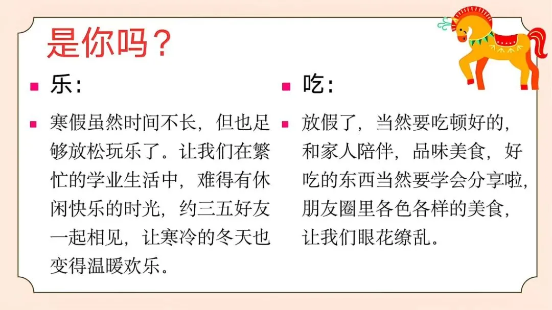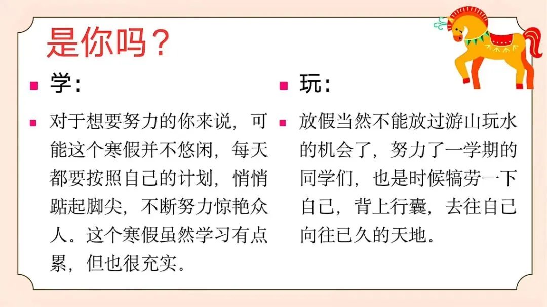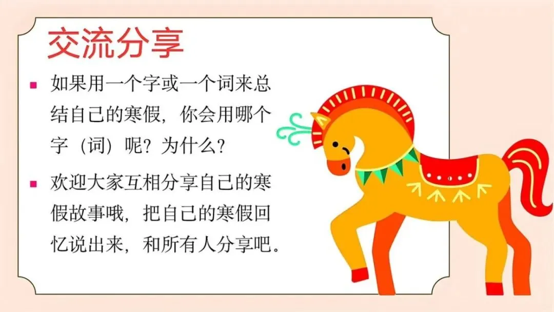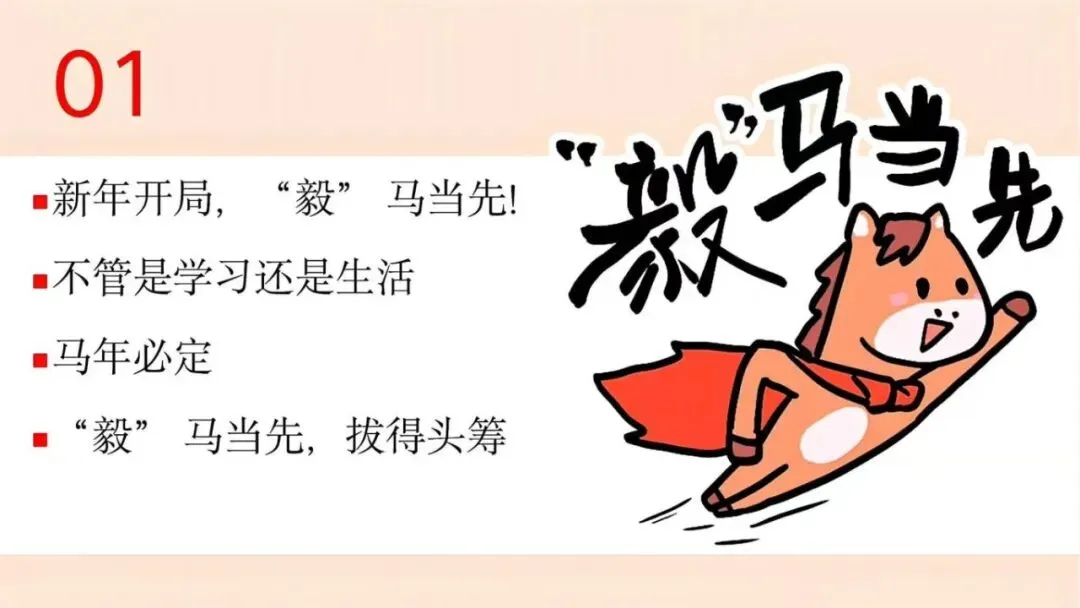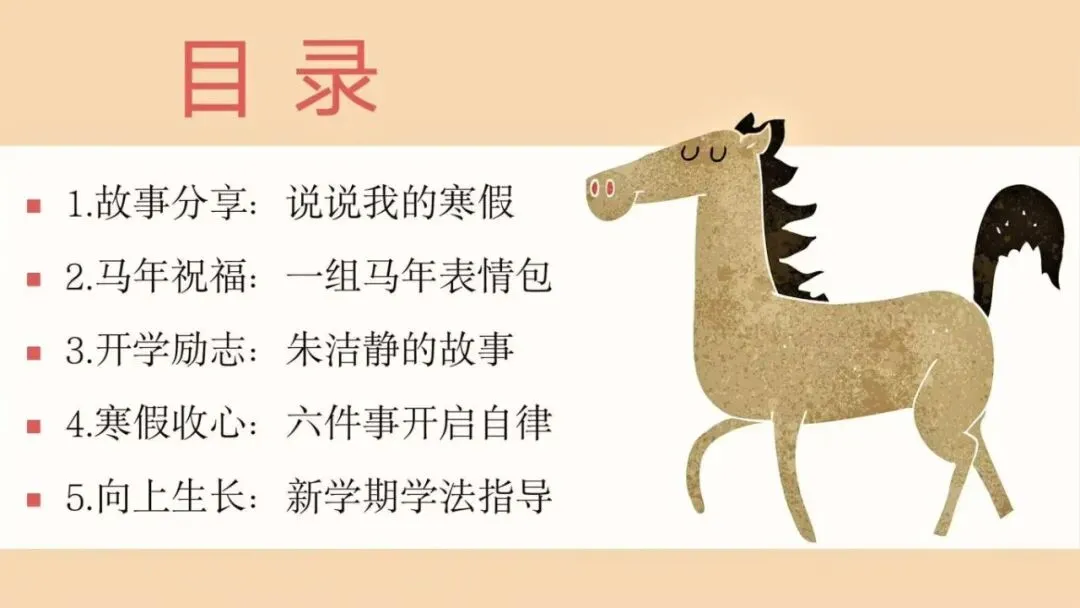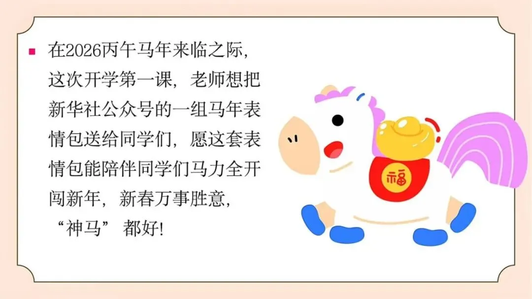 大家好!我是佑星妈妈,今天分享的学习资料是:【通用版】2026年寒假收心主题班会PPT课件:寒假归来,骉腾万里,PPT格式可编辑可修改,免费领取。如果这份资料不错,欢迎分享给更多身边的同事朋友,让教育教学更轻松且高效。