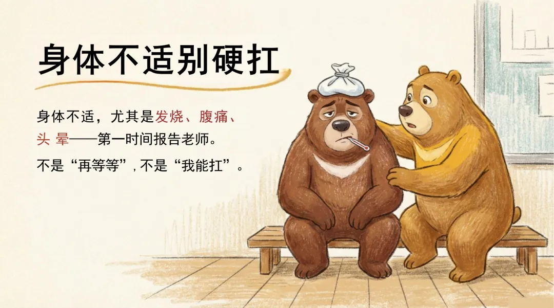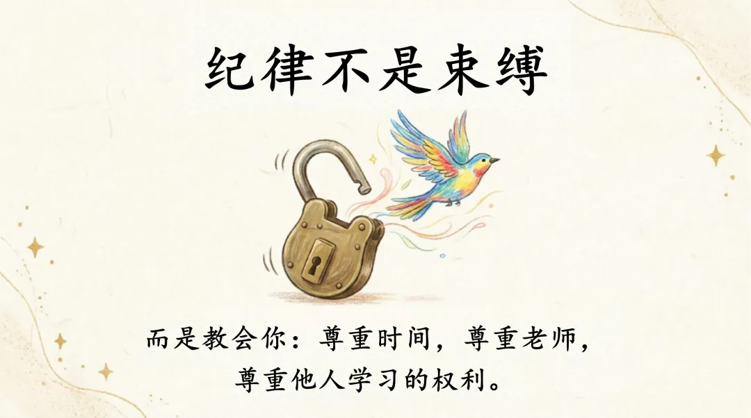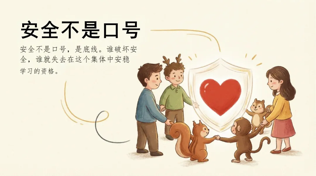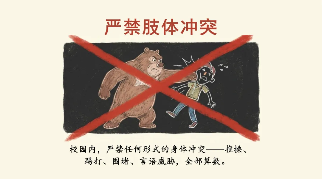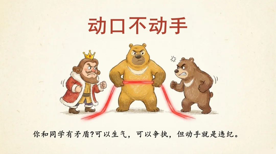 安全作为高压线,明确严禁肢体冲突、校园奔跑打闹,违禁品禁止入校,身体不适及时报告等要求,清晰的处罚标准让学生知晓越线后果;