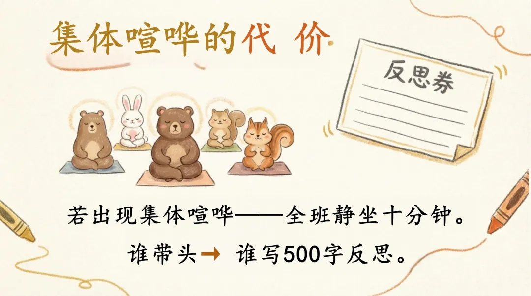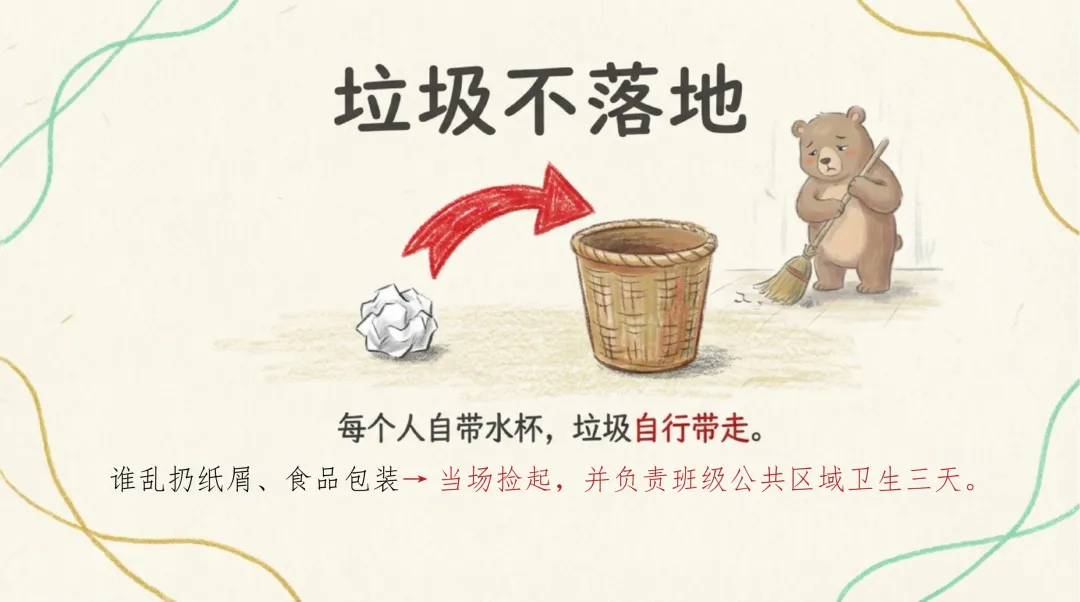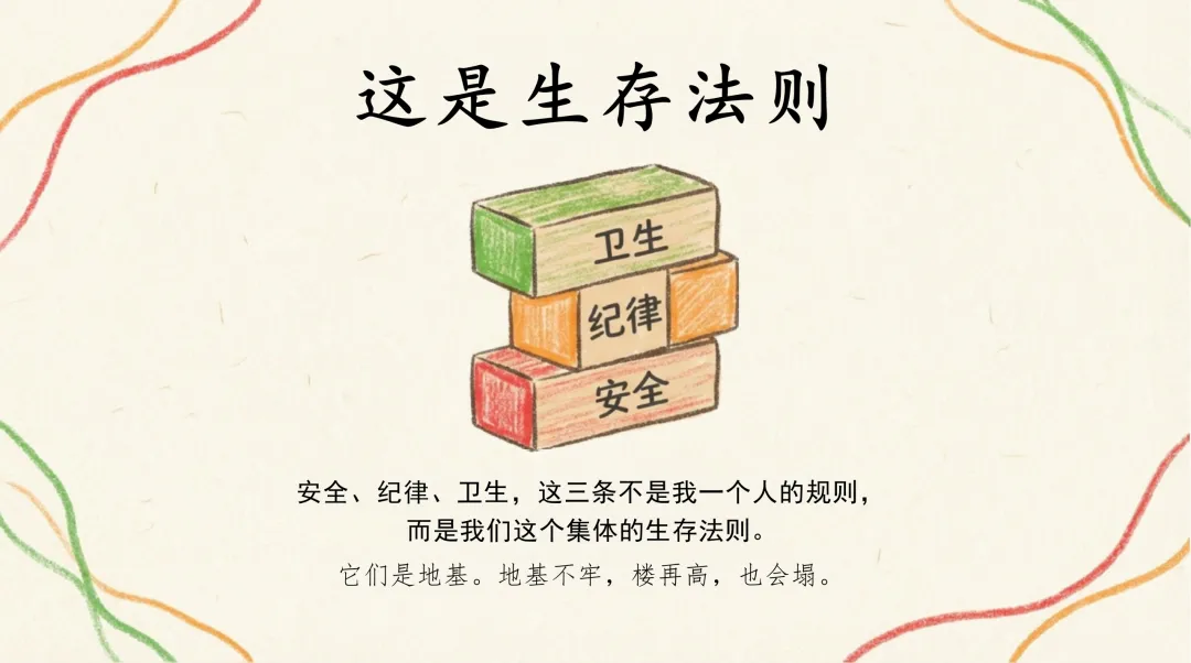 ppt中划定了安全、纪律、卫生三条不可触碰的铁律,也是班级管理的三大底线,每条规则都有具体要求和明确处罚标准,不是模糊的建议,而是能直接落地执行的班级准则。