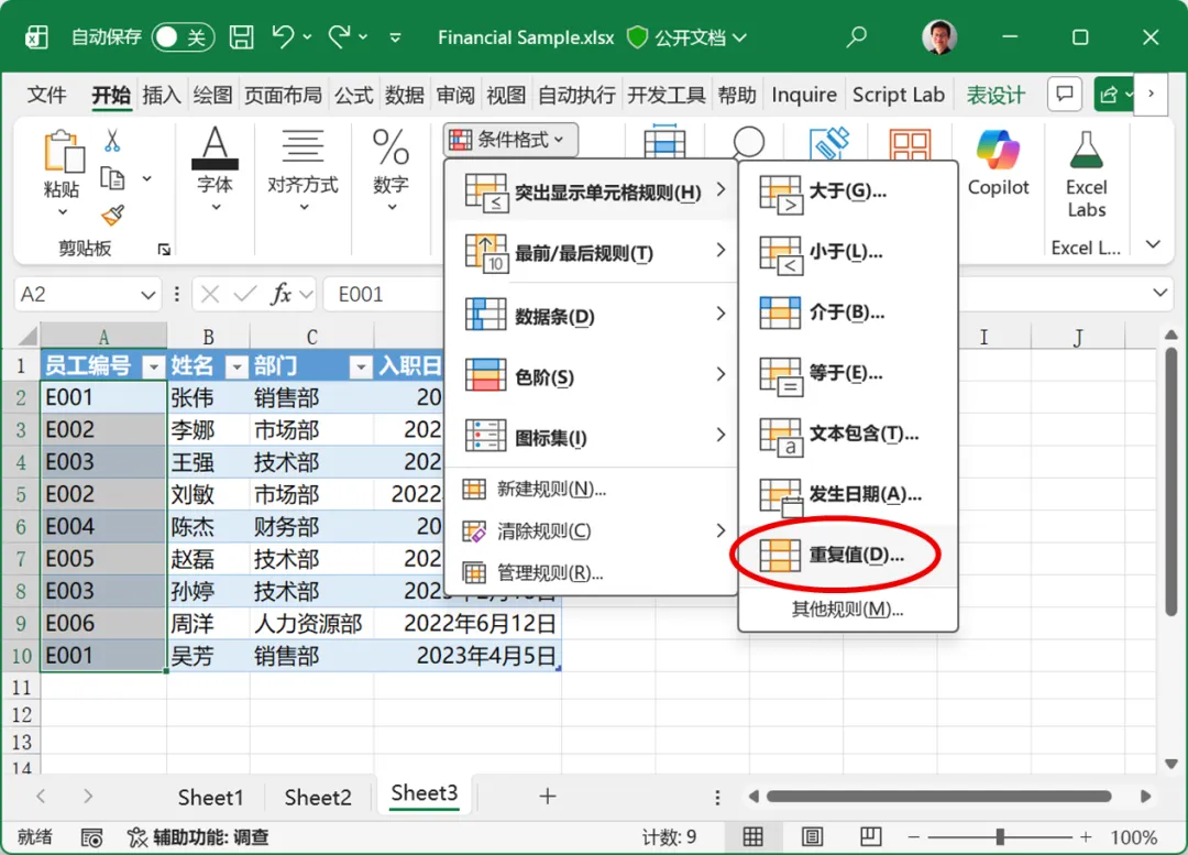 你可以借助 Excel 中“条件格式”功能提供的“重复值”突出显示单元格规则,快速将重复数据标记为显眼的颜色。