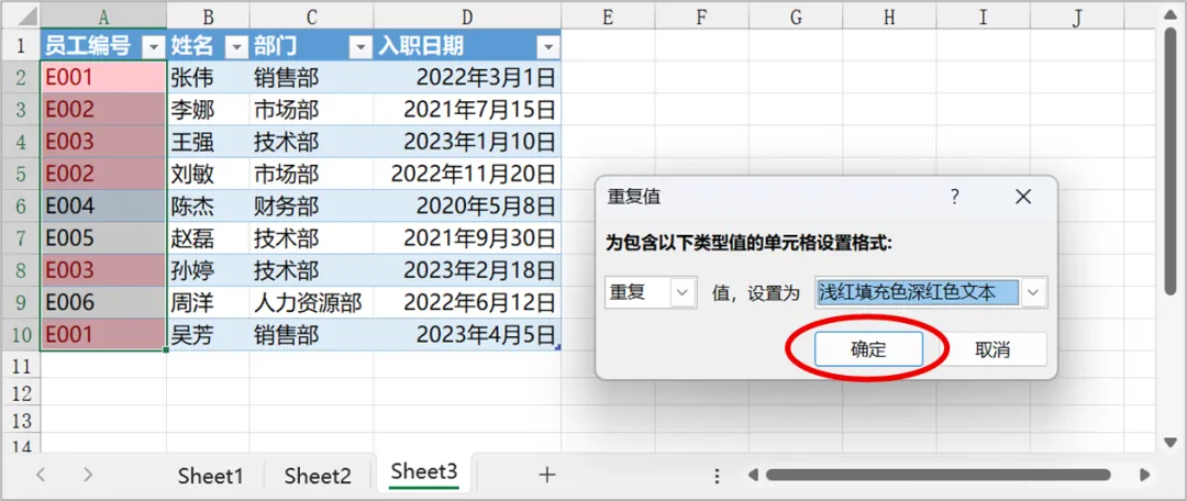 然后,在“重复值”对话框中,指定重复值的显示格式,并单击【确定】按钮,所选列中的重复值就会按照指定的显示格式历历在目了。