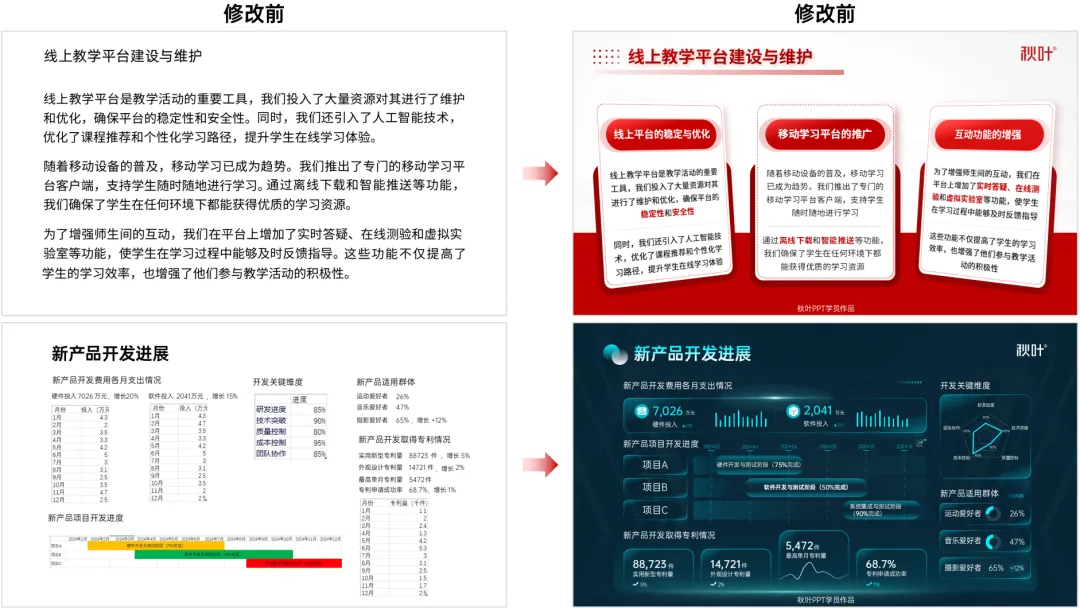 很简单,同样是字多的 PPT,下面修改前和修改后,你觉得老板更喜欢哪种 ↓