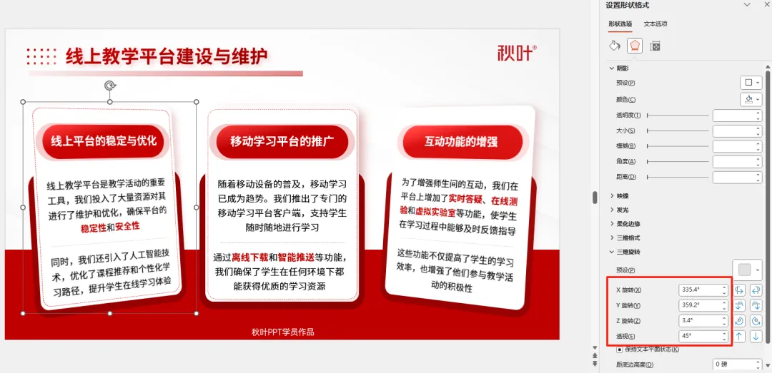 全选左侧卡片元素-【Ctrl+G】组合,再右键【设置形状格式】-【三维旋转】: