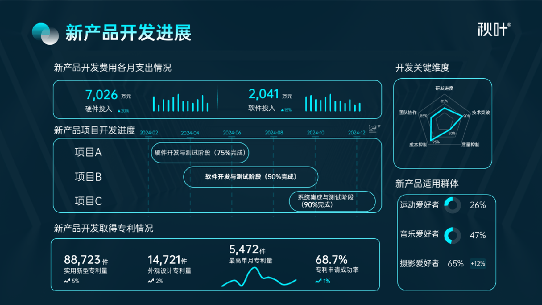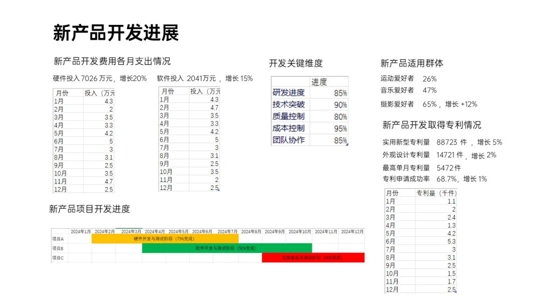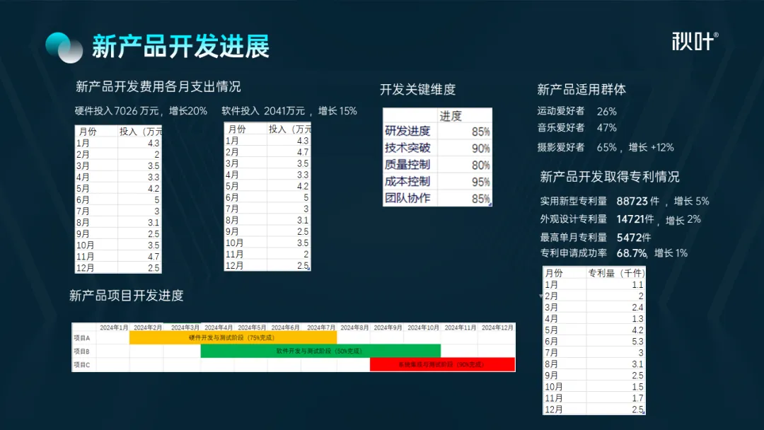 接着再精简各个模块的内容,突出重点数据,弱化非重点数据,并用合适的图表来替代表格: