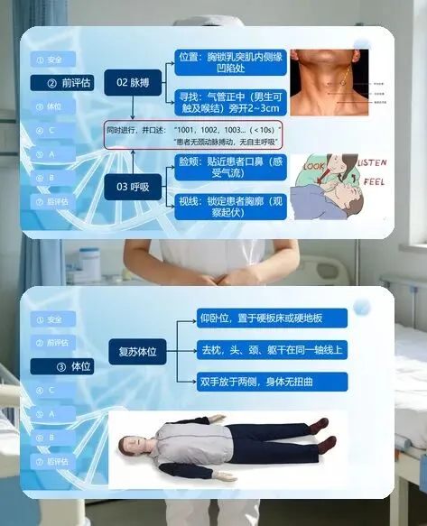想要做好 CPR,其实不用死记硬背,跟着 “安全 - 评估 - 体位 - CAB - 后评估” 的步骤走就行,核心就抓胸外按压、开放气道、人工呼吸这三部曲。先确认现场安全,做好自身防护,再快速判断患者的意识、脉搏和呼吸,十秒内得出结论,同时大声呼救,让人帮忙打 120、取 AED。