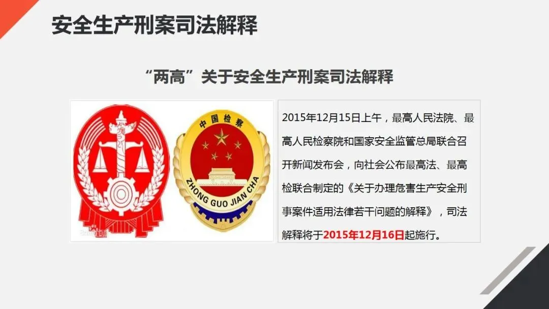 2015年12月15日上午,最高人民法院、最高人民检察院和国家安全监管总局联合召开新闻发布会,向社会公布最高法、最高检联合制定的《关于办理危害生产安全刑事案件适用法律若干问题的解释》,司法解释将于2015年12月16日起施行。