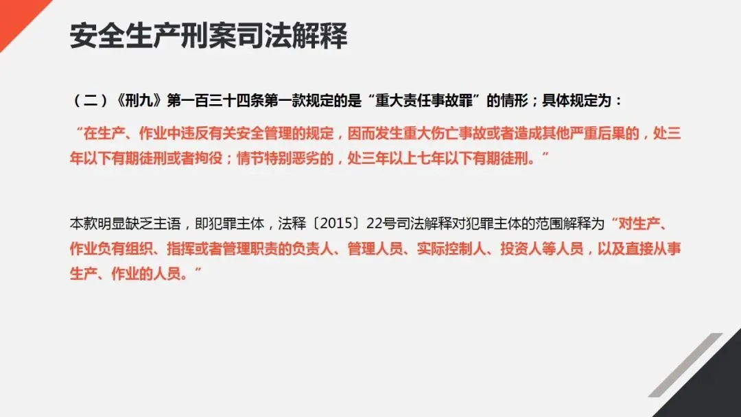 这则司法解释对定罪量刑标准作出明确规定,原则上以死亡一人、重伤三人,或者造成直接经济损失一百万元作为入罪标准。