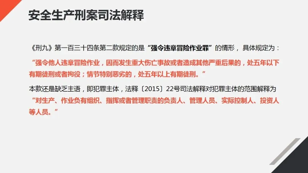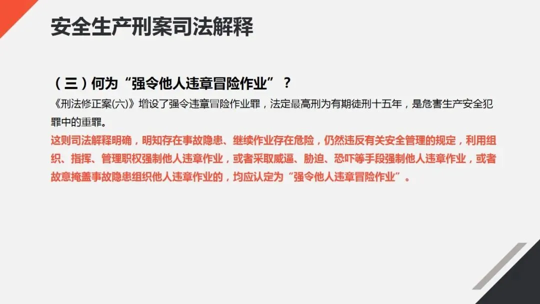这则司法解释明确,明知存在事故隐患、继续作业存在危险,仍然违反有关安全管理的规定,利用组织、指挥、管理职权强制他人违章作业,或者采取威逼、胁迫、恐吓等手段强制他人违章作业,或者故意掩盖事故隐患组织他人违章作业的,均应认定为“强令他人违章冒险作业”。