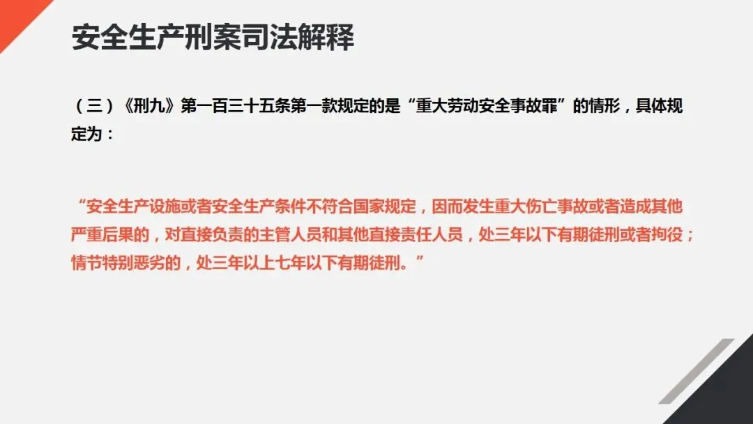(三)《刑九》第一百三十五条第一款规定的是“重大劳动安全事故罪”的情形,具体规定为: