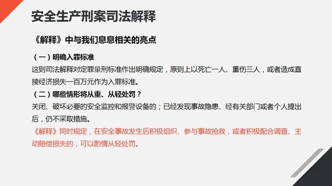 《解释》同时规定,在安全事故发生后积极组织、参与事故抢救,或者积极配合调查、主动赔偿损失的,可以酌情从轻处罚。