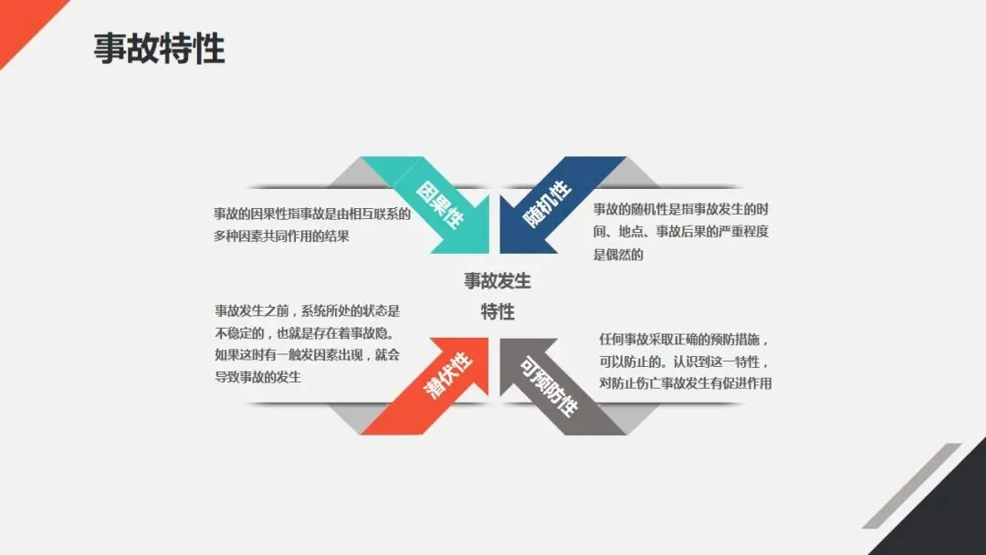 可预防性:任何事故采取正确的预防措施,可以防止的。认识到这一特性,对防止伤亡事故发生有促进作用。