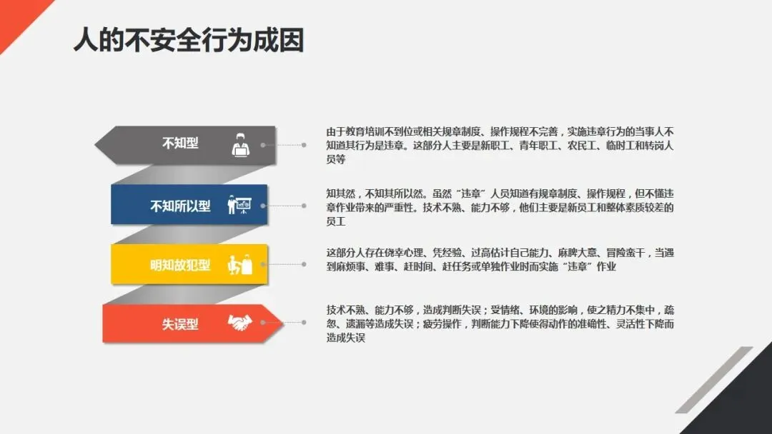 不知型:由于教育培训不到位或相关规章制度、操作规程不完善,实施违章行为的当事人不知道其行为是违章。这部分人主要是新职工、青年职工、农民工、临时工和转岗人员等;