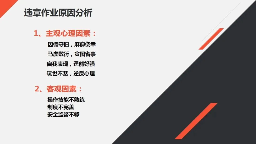 明知故犯型:这部分人存在侥幸心理、凭经验、过高估计自己能力、麻痹大意、冒险蛮干,当遇到麻烦事、难事、赶时间、赶任务或单独作业时而实施“违章”作业;