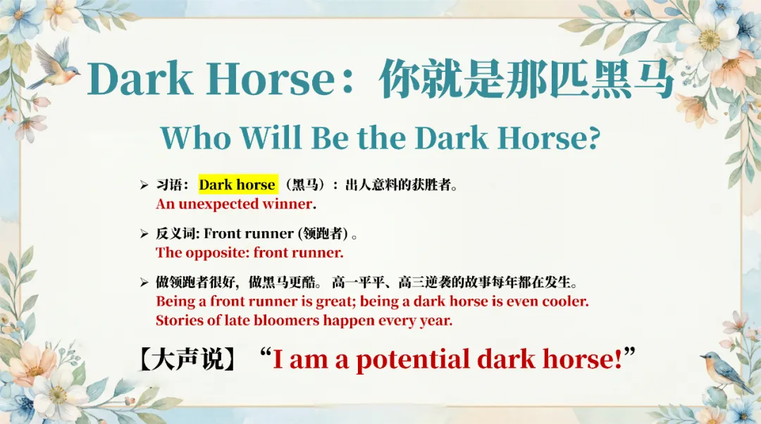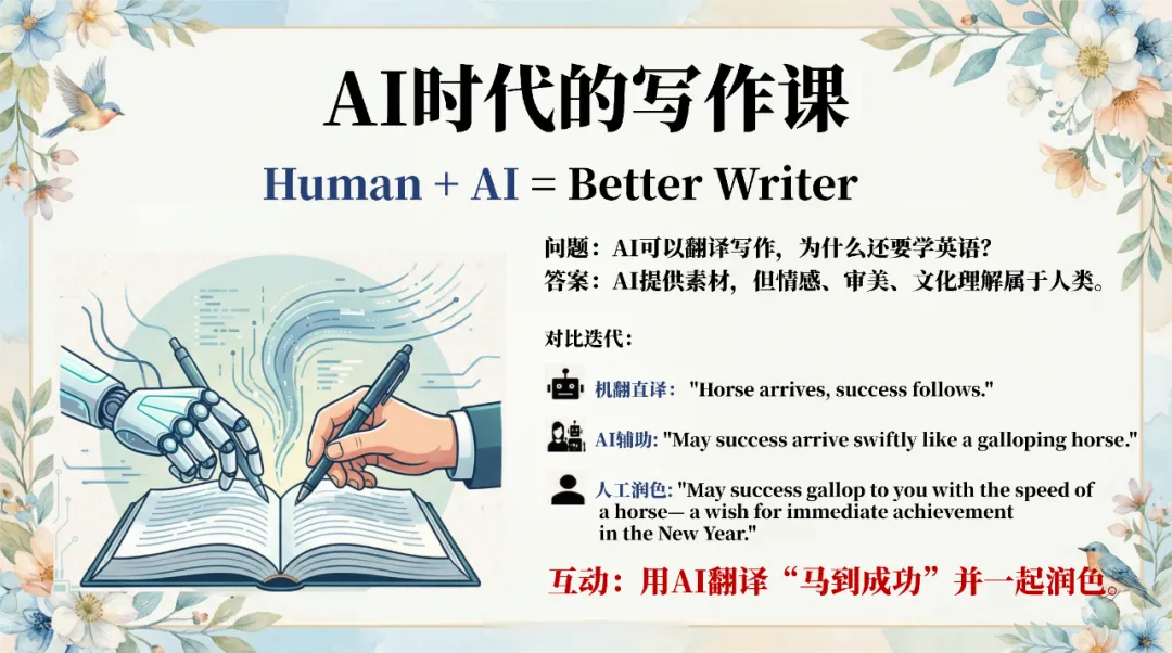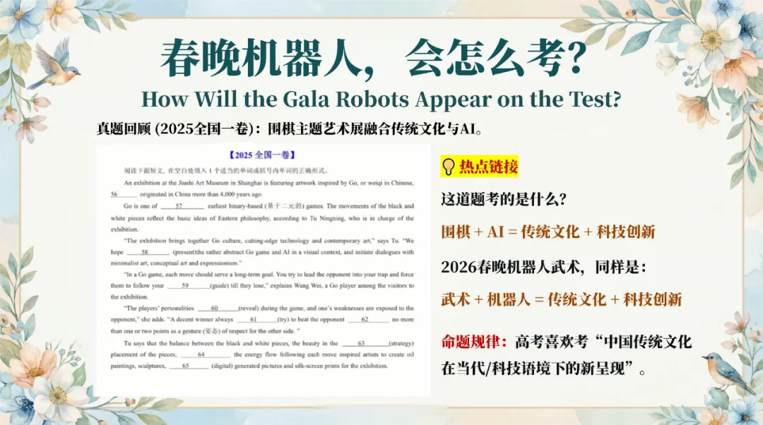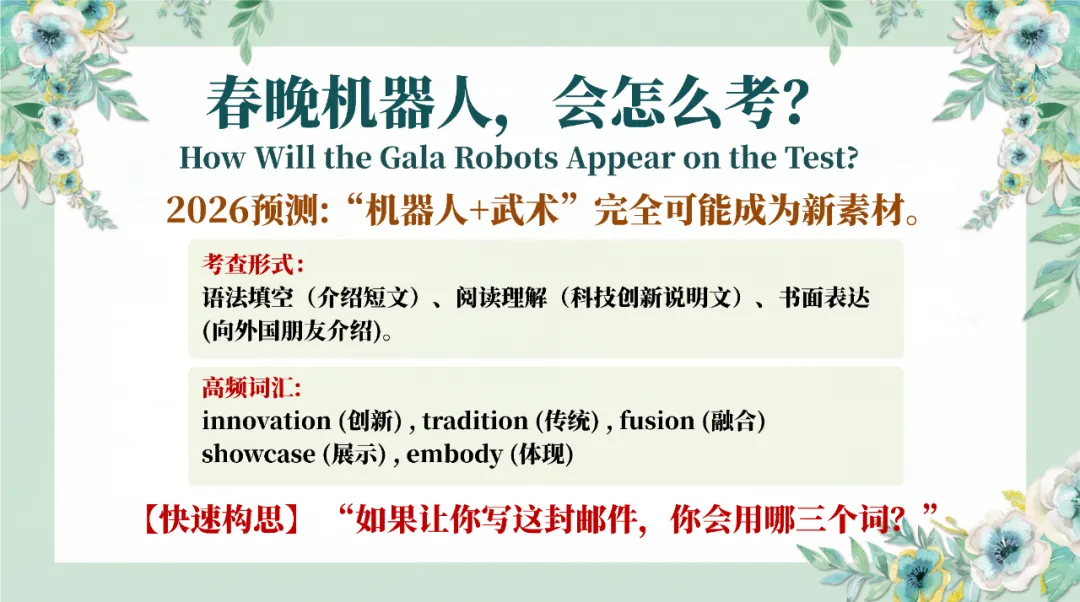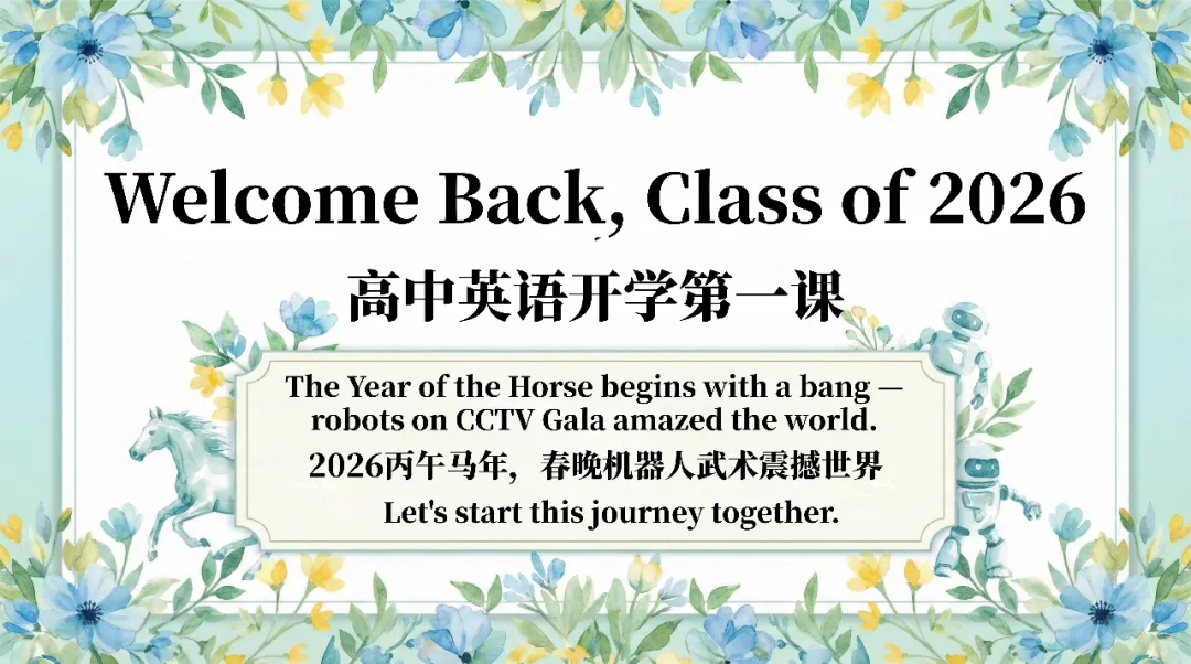 马年专属板块精选 dark horse、horse sense 等经典习语,搭配励志金句,贴合节日氛围又积累实用表达;最后从热点直通考点,结合高考真题规律,预测机器人 + 武术的考查形式,梳理高频词汇,还设计了 AI 时代英语学习的思考,让课堂衔接应试需求。