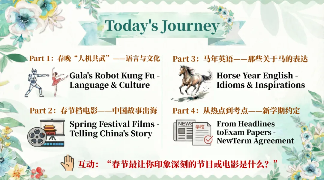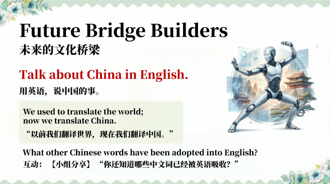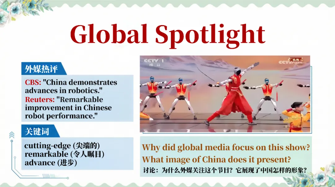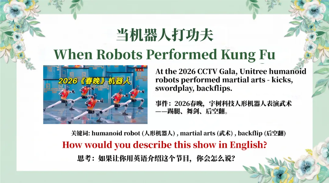 从 2026 春晚机器人武术表演切入,解读语言与文化的深层关联,探讨 Wushu 等中式借词的文化自信;再以春节档电影出海为例,分析英文译名的文化密码,让学生理解如何用英语讲好中国故事;