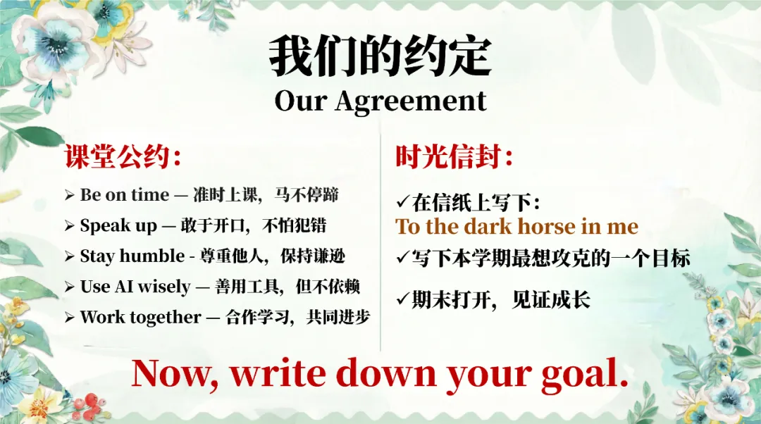 ppt全程穿插丰富互动环节,小组讨论、大声宣言、时光信封等设计,充分调动课堂氛围,同时融入大量高考高频词汇、语法考点,兼顾趣味性与实用性。