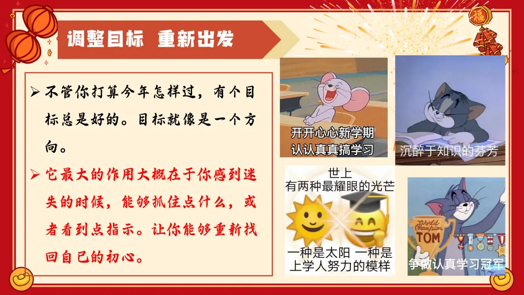 第四板块新学期新目标,设计目标制定表、学习搭子打卡、目标宣言等内容,引导学生树立新学期学习目标,激发学习动力。