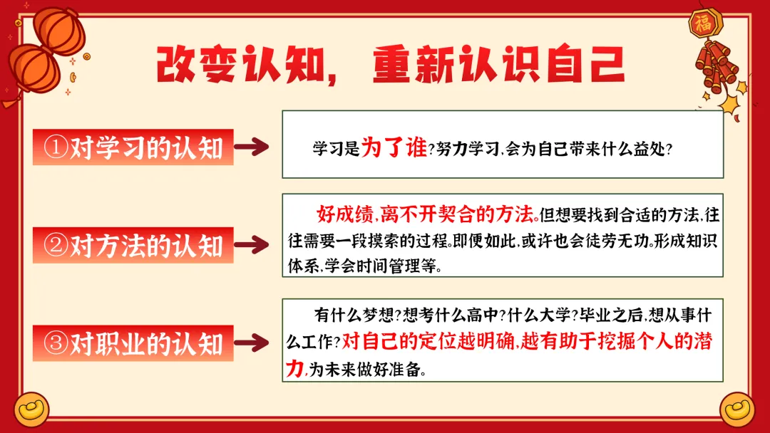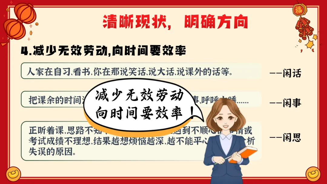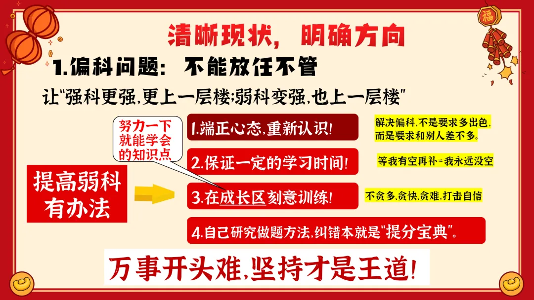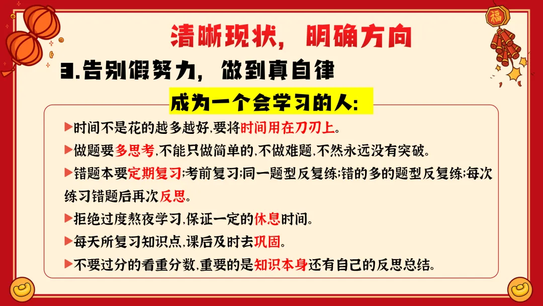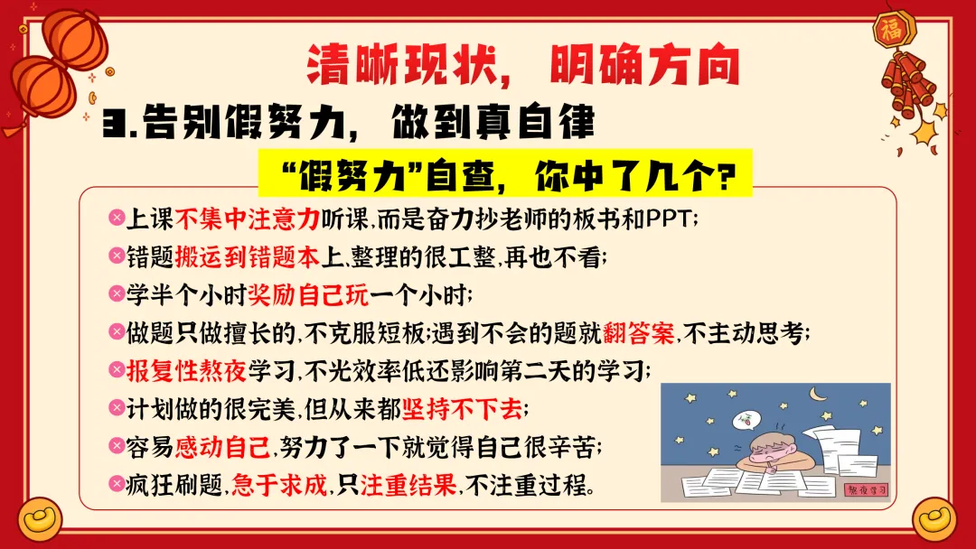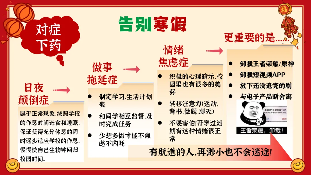 第二板块开学收心指南,精准戳中开学焦虑、日夜颠倒、假努力等学生通病,给出对症解决方法,还融入偏科补救、时间管理四象限法则等实用技巧,帮学生快速调整学习状态;