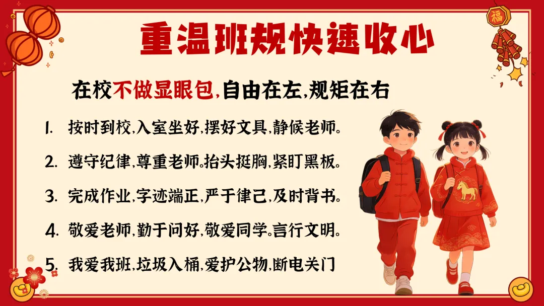 这款2026春季开学第一课收心主题班会ppt,从趣味互动到收心方法,从班规重温到目标制定,让学生快速收心。