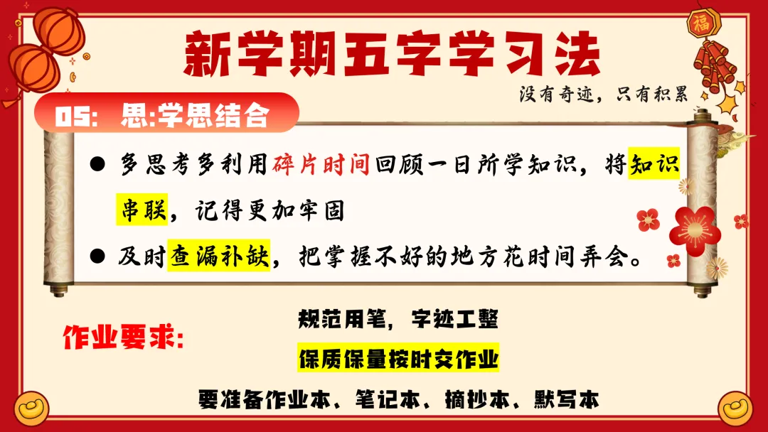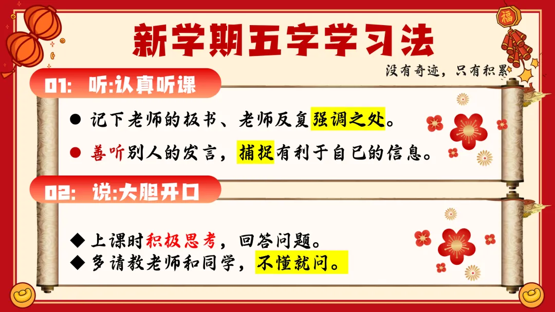 第三板块重温班规,明确课堂、校园行为规范,搭配五字学习法,让学生清晰新学期学习要求;