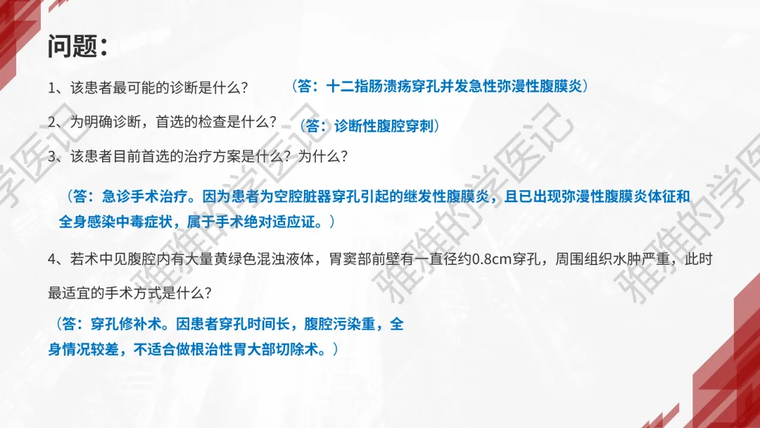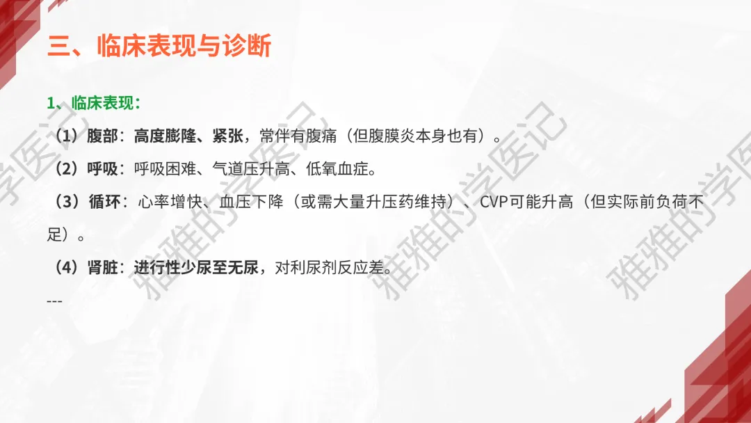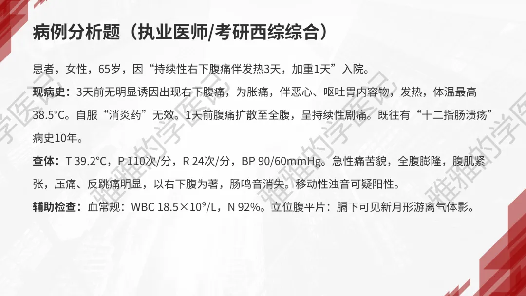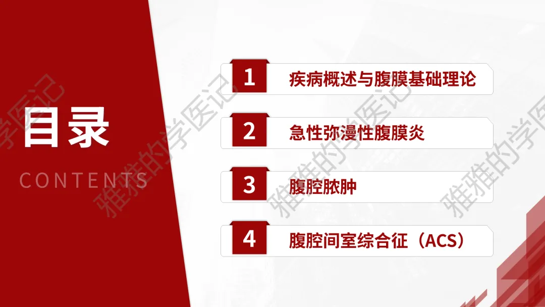 本PPT内容引用自《外科学(人卫第9、10版)》等权威文献,PPT版权归本公众号所有,制作与审稿均由小编独立完成。关注公众号为“雅雅的学医记”,获取更多专业健康知识。这份PPT凝聚了专业知识与临床经验,对急性化脓性腹膜炎这一症状具有认识,并了解学习的意义,欢迎大家分享转发,共同学习,期待与大家的互动!目前学识有限,欢迎大家的指正。内容说明:急性化脓性腹膜炎,制作完成,目前正在公众号更新,需要笔记版请联系雅雅(免费)。- 知识点,需要不断积累,并梳理整理为自己的。加油!书山有路勤为径,学海无涯苦作舟。(韩愈)
