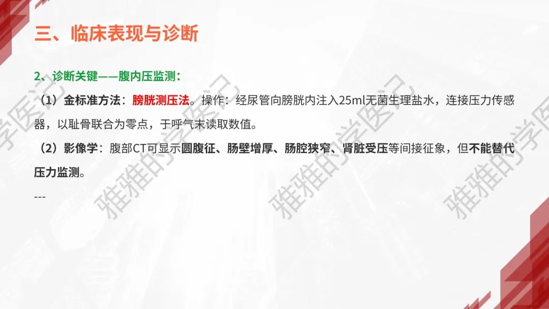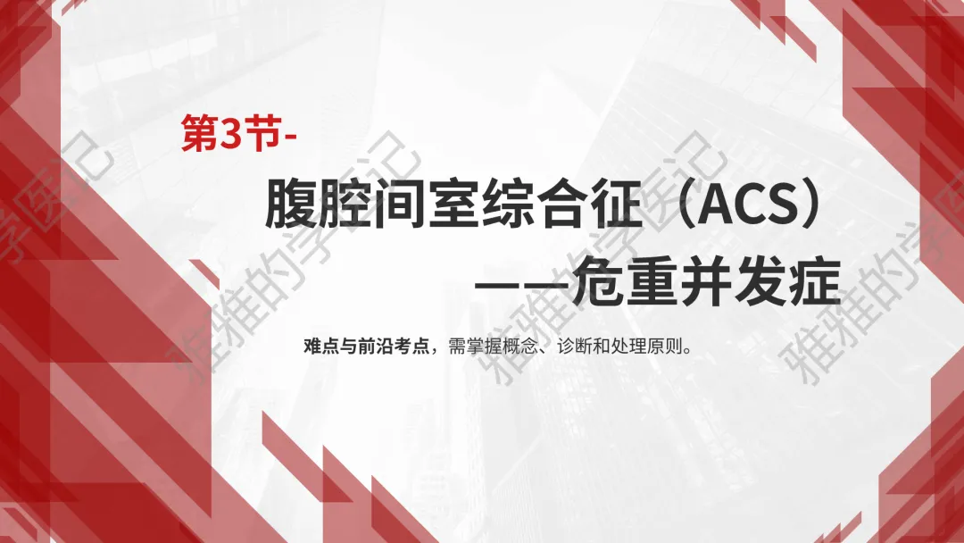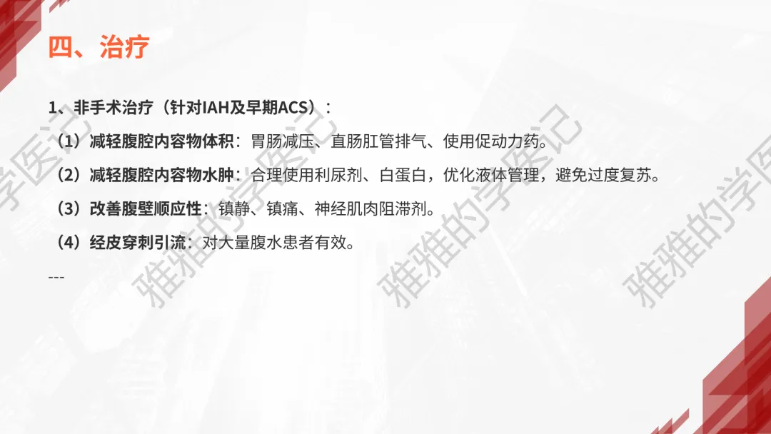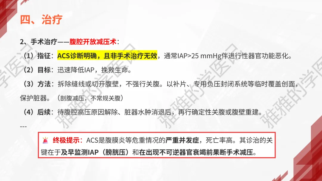关注公众号,发送关键词“急性化脓性腹膜炎”获取信息!本次内容为:外科学(第10版),第7篇-腹部外科疾病,第3章-急性化脓性腹膜炎,第4节-腹腔间室综合征(ACS)。本PPT由本公众号精心制作,全面深入地了解急性化脓性腹膜炎这一重要议题。旨在与大家一同探讨学习,助力提升对腹部外科疾病的认知与实践水平。本演示文稿仅供教育和信息分享,不构成医疗建议。使用时请结合临床指南、专家共识及患者病情综合评估,医疗决策需咨询专业人员并参考最新研究成果。制作者和发布者对使用后果不承担责任,使用信息应遵循专业医疗实践规范,保障患者安全。