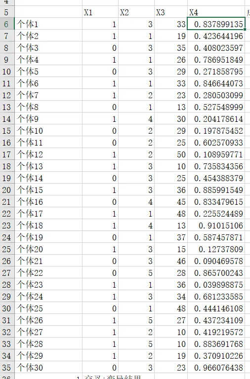 第二步是随机选择两组的个体,其Excel设置函数为=INDEX(A6:A35,RANDBETWEEN(1,COUNTA(A6:A35))),其大一为在个体列中,根据随机数抽取一个结果出来。第三步是将随机选择的适应性函数匹配出来,在这里选择=VLOOKUP(K6,$A$6:$I$35,9,FALSE)即可。第四步是优选出更优秀的个体,我们根据适应性结果,去匹配合适的个体,在这里选择=INDEX($K$6:$K$7,MATCH(MAX($L$6:$L$7),$L$6:$L$7,0))进行提取。在这里我们选择了3个个体作为后面杂交的基础,我试了2个个体,发现容易钝化,所以用3个个体比较合适。