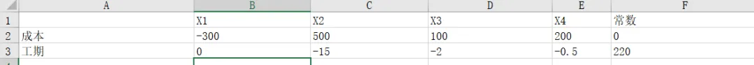 工期函数Time = 220 - 15X1 - 2X_2 - 0.5X_3