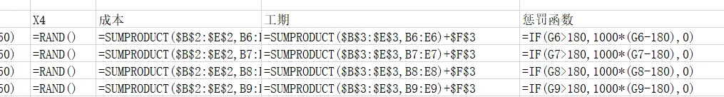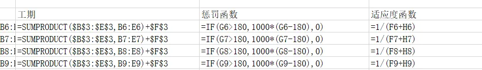 接下来,我们在通过Excel的Sumproduct和IF函数进行设定。核心就是将生成的方案计算出其相应的成本和工期进行结合。接下来是设置适应度函数,适应度函数为成本和惩罚函数的反函数,也就是工期和成本越大,适应性越小。选择操作:让好方案“活下来”