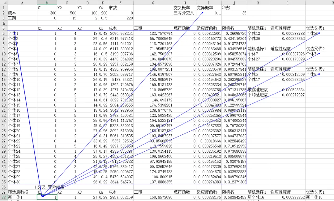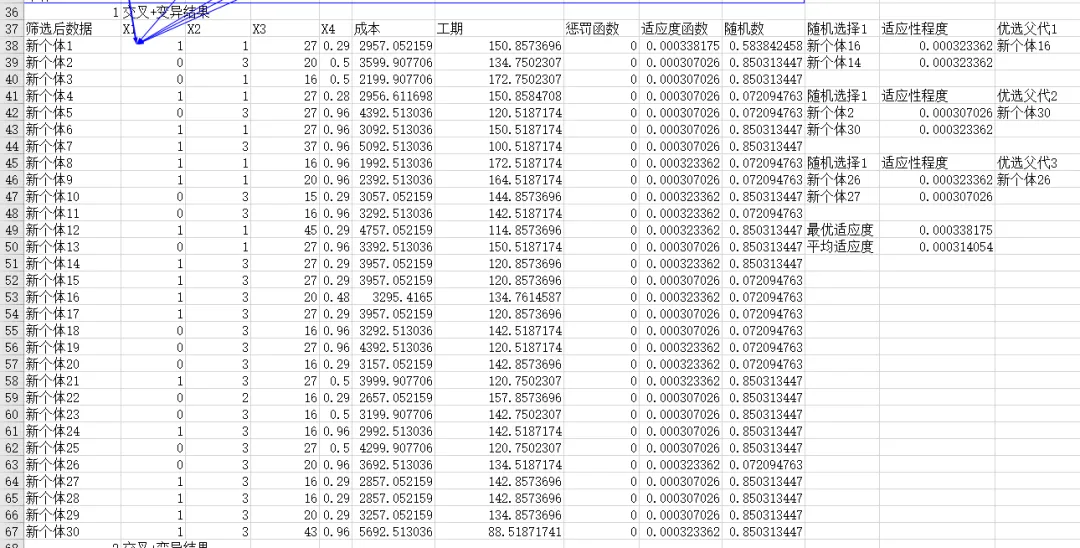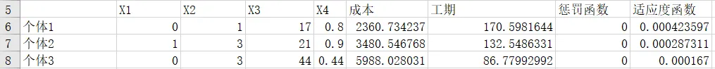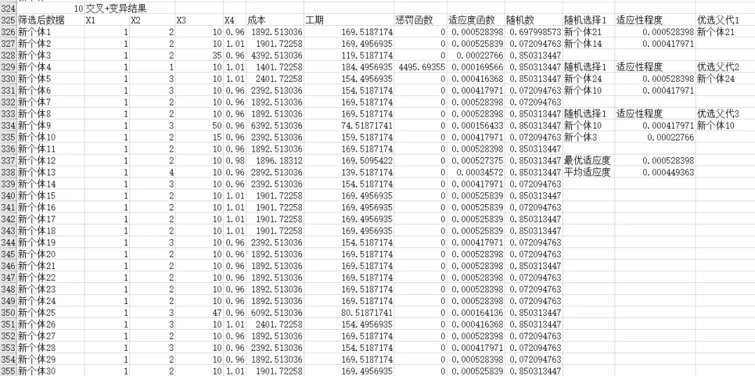首先根据交叉和变异结果生成新方案,然后计算成本和工期,接下来计算适应度函数,优选个体,我们将其公式自动化,就可以通过反复粘贴是实现迭代啦。左上角的1是第一次。